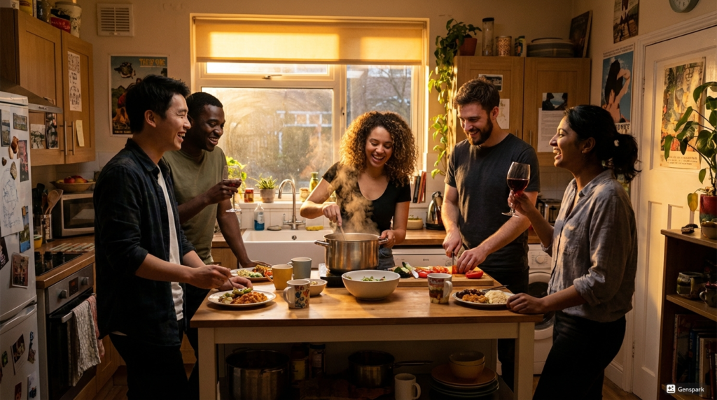 週末に一緒に料理を作ったり、リビングで談笑したり。適度な距離感で交流できる環境は、海外生活の孤独感を和らげてくれます。
